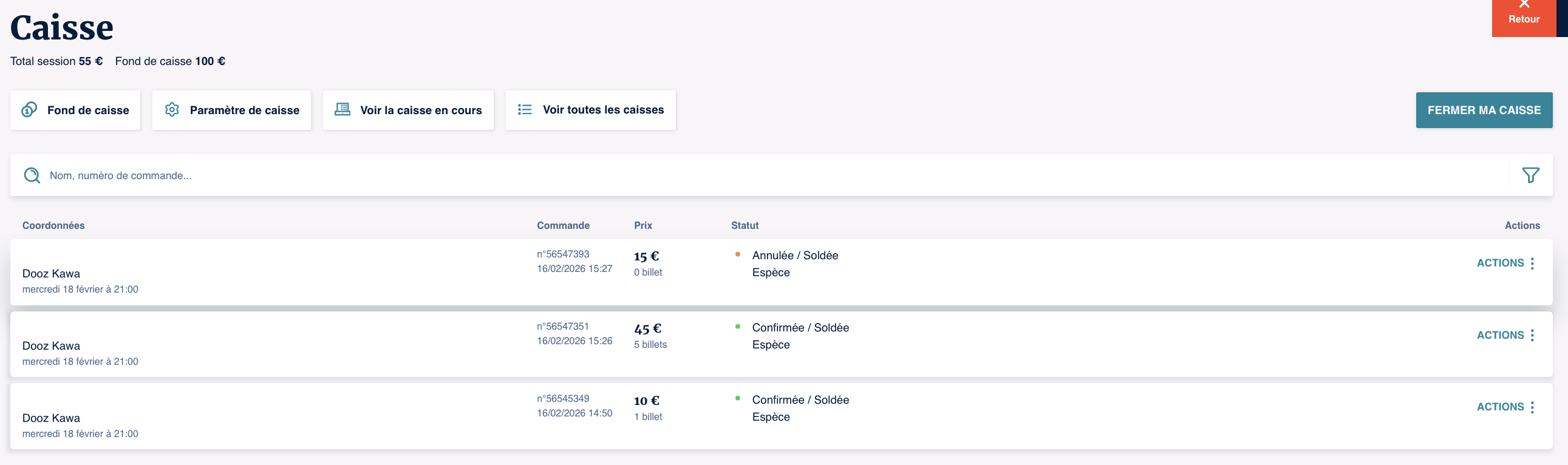 Sur cet écran, vous aurez la liste des opérations réalisées dans la caisse en cours. Si besoin, vous pouvez ici effectuer un filtrage des commandes.