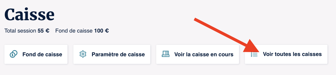 Sur cette page, en cliquant sur "Voir toutes les caisses", vous accédez à l'ensemble des caisses en cours (ouvertes) mais aussi des caisses précédemment fermées.