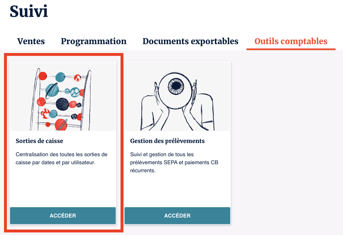 Il est également possible d'accéder à l'ensemble des caisses depuis le menu "Suivi" en allant dans l'onglet "Outils comptables" puis "Sorties de caisse".