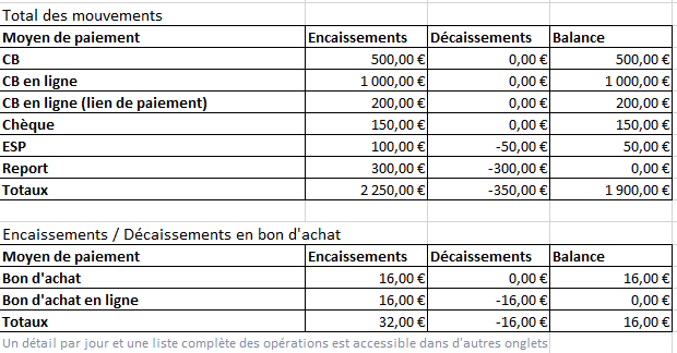 Ici, on a donc un total de 1900 € sur les encaissements/décaissements (total des mouvements) et un total de 16 € pour les encaissements/décaissements en bon d'achat.