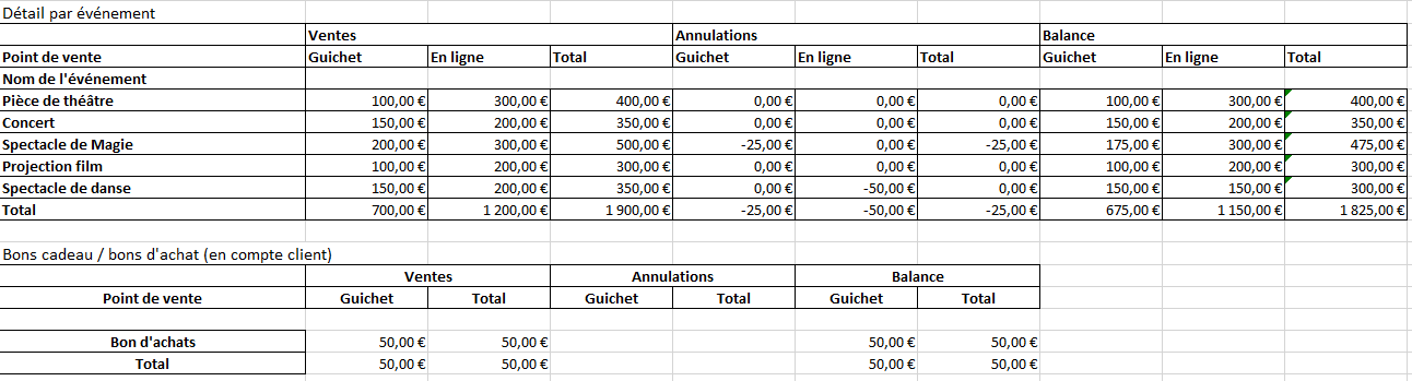 Ici, on a donc un total de 1825 € de recettes sur les événements et un total de 50 € pour les recettes de bon d'achat.