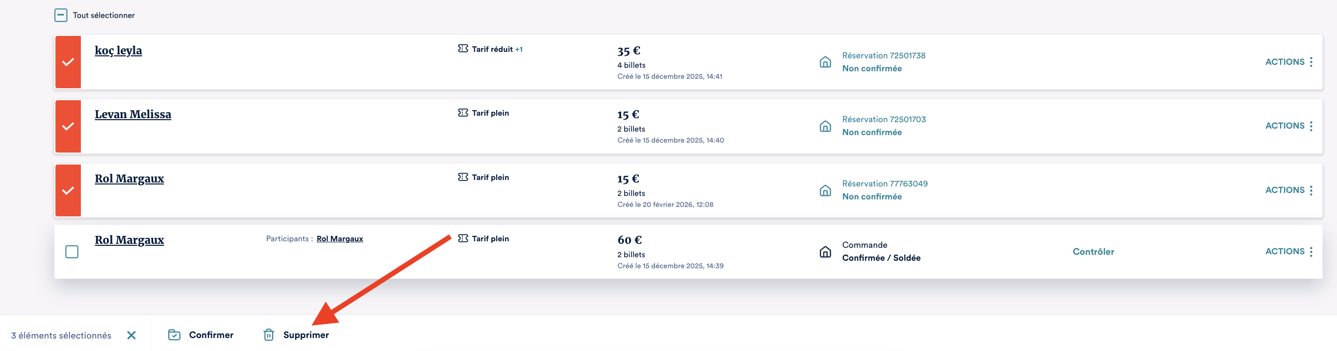 Une fois dessus, vous pouvez soit sélectionner toutes les réservations d'un coup, soit cocher une à une celles que vous voulez confirmer.