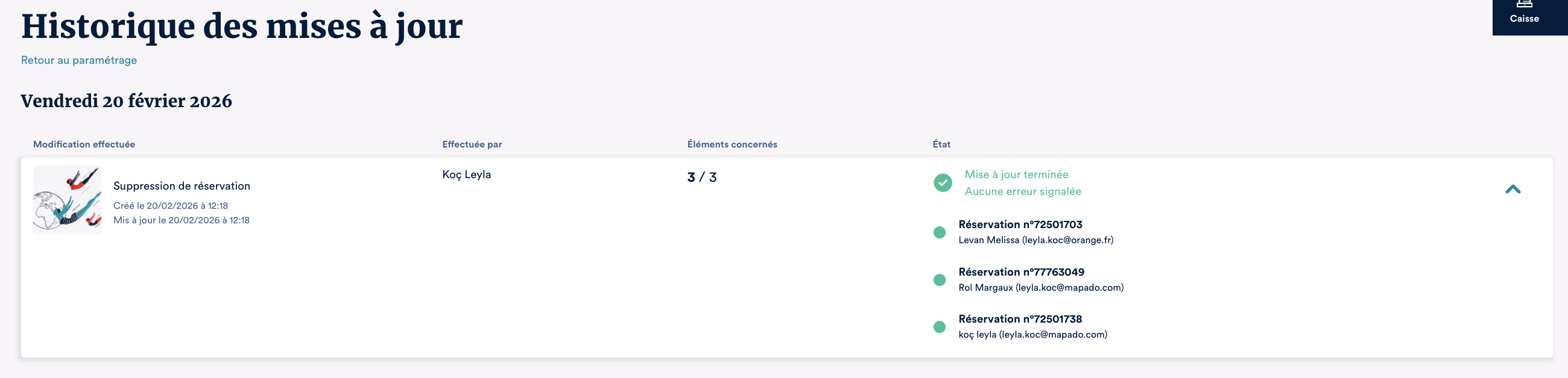 Il est également possible de suivre l'historique des modifications sur les réservations à partir de brique "Paramétrage" (depuis votre barre de menu latérale). Ensuite, dans les paramétrages optionnels, si vous cliquez sur "Historique des mises à jour", vous verrez les actions que vous avez effectuées sur les réservations.