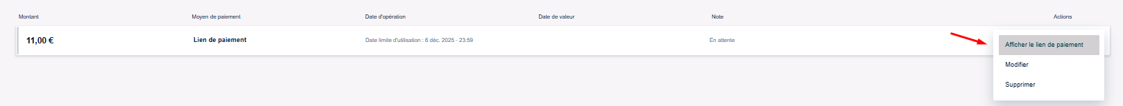 Si vous souhaitez renvoyer le lien de paiement à votre participant, vous trouverez le lien dans la commande, via l'onglet Transactions, depuis les 3 petits points d'actions de la ligne "Lien de paiement" :