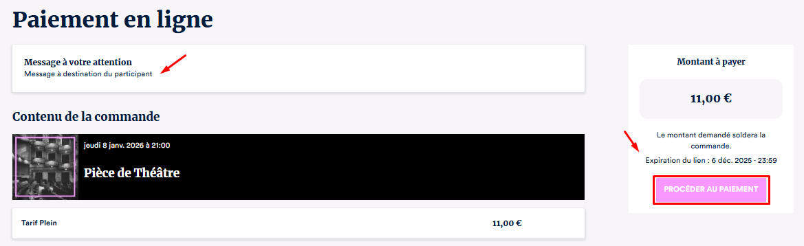 - Les commandes payées via un lien de paiement n'apparaitront pas dans le compte utilisateur du participant s'il en dispose.