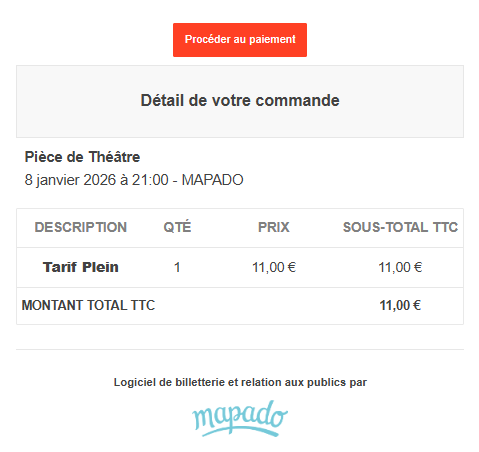 Un mail est automatiquement envoyé dès lors que vous avez renseigné l'adresse mail du participant. Il lui faut alors cliquer sur "Procéder au paiement" qui le redirige vers un panier du minisite contenant les billets ajoutés lors de la commande au guichet.