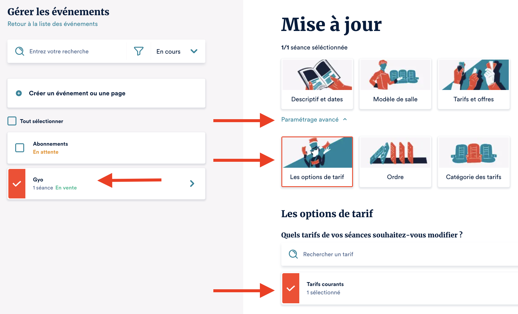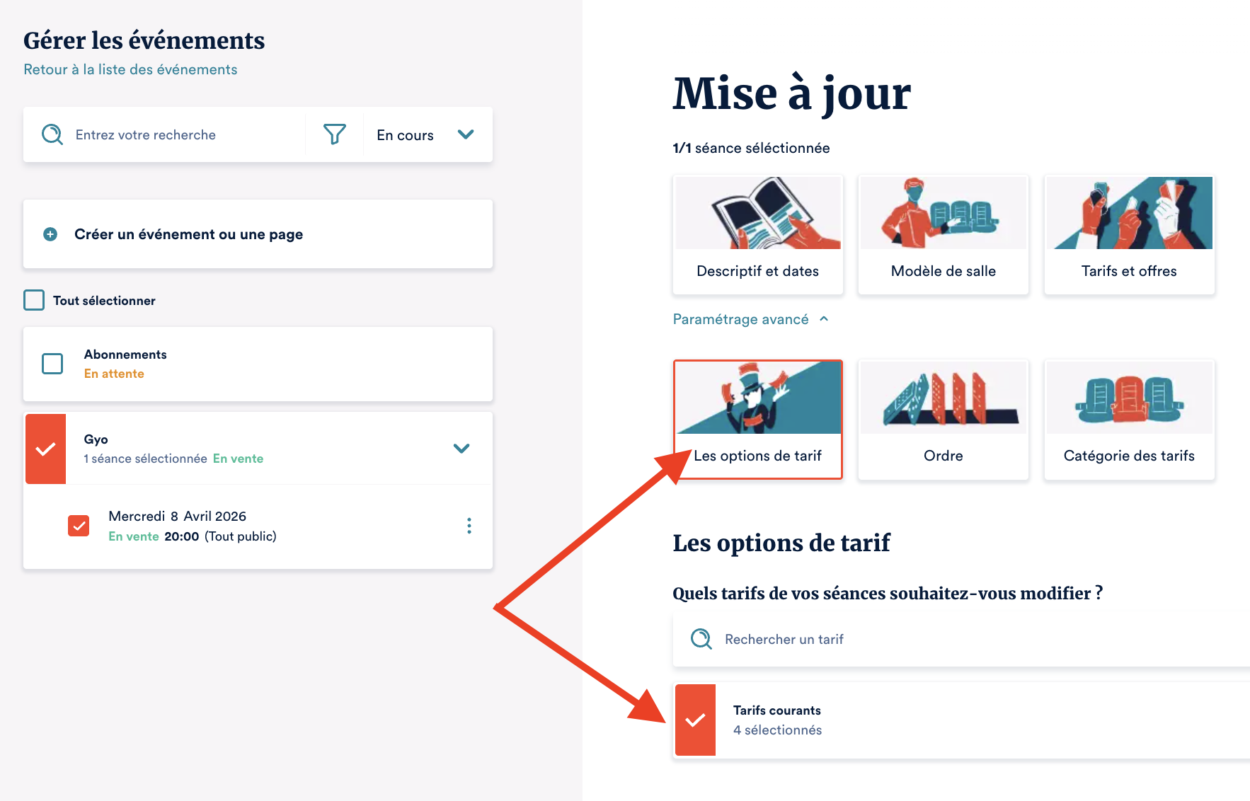 Si vous avez besoin de modifier un événement ou plusieurs, il est possible de revenir dessus pour ajouter de nouvelles informations comme un nouveau tarif ou une nouvelle séance. Modifier un événement Rendez-vous dans l'événement à modifier et ...