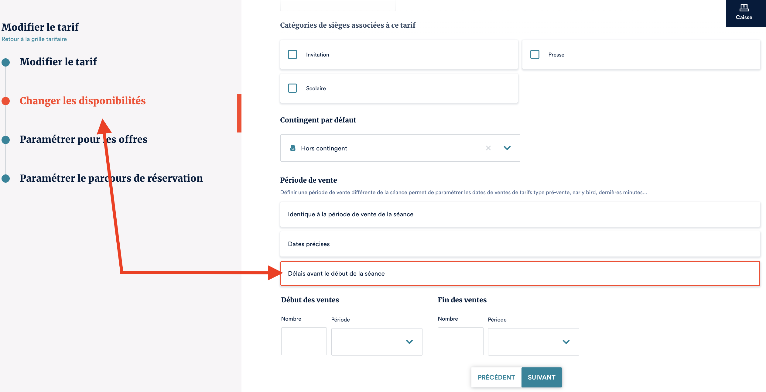 Lorsque vous appluqyez des délais sur un tarif, vous avez la possibilité de voir cette information au guichet en vous rendez sur la séance puis sur l'onglet paramétrage vous verrez cela :