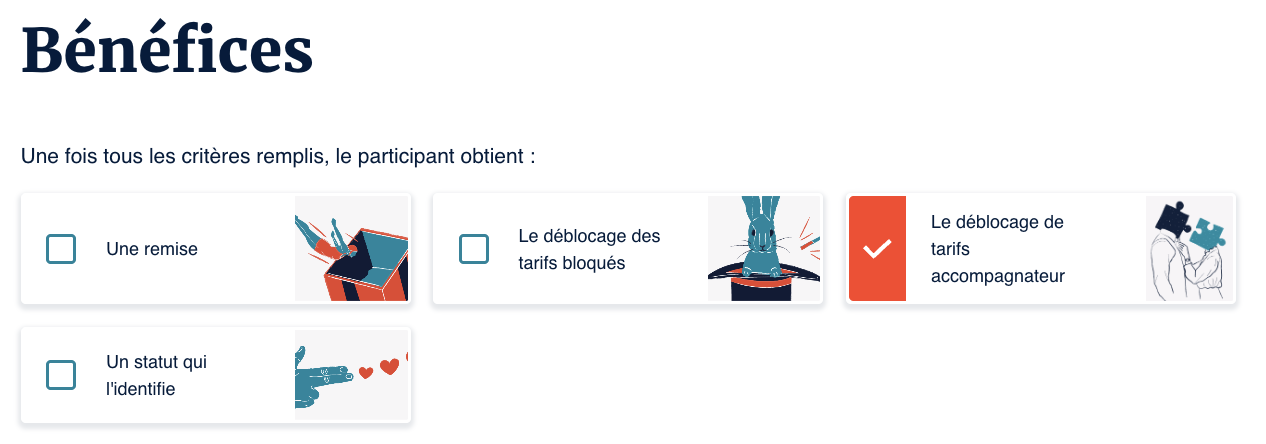 15 mars 2026 [Offre] Ajout d'un bénéfice Dans le paramétrage d'une offre, vous pouvez désormais voir un nouveau bénéfice qui se nomme "Le déblocage de tarifs accompagnateur". Il permet de débloquer les tarifs accompagnateur uniquement si un autre tarif de la même séance est présent dans le panier. |