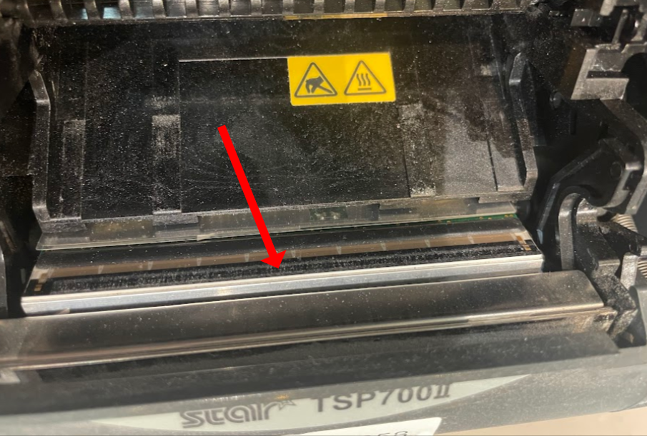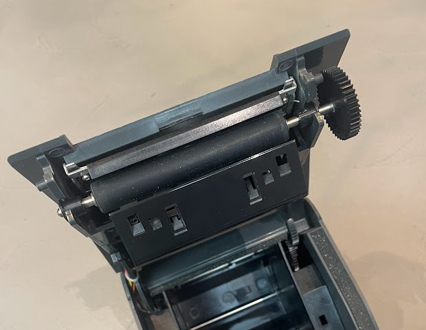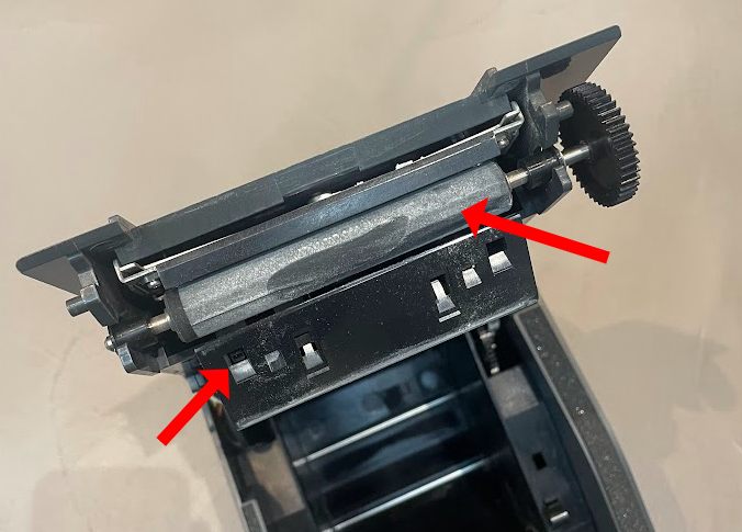 Les trois zones à nettoyer plus particulièrement sont le rouleau d'entrainement, le détecteur de marques noires et la tête d'impression thermique.