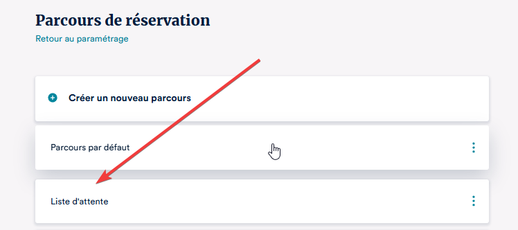 Sur l'écran "Parcours de réservation", sélectionnez "Liste d'attente" (le parcours créé à l'étape précédente)