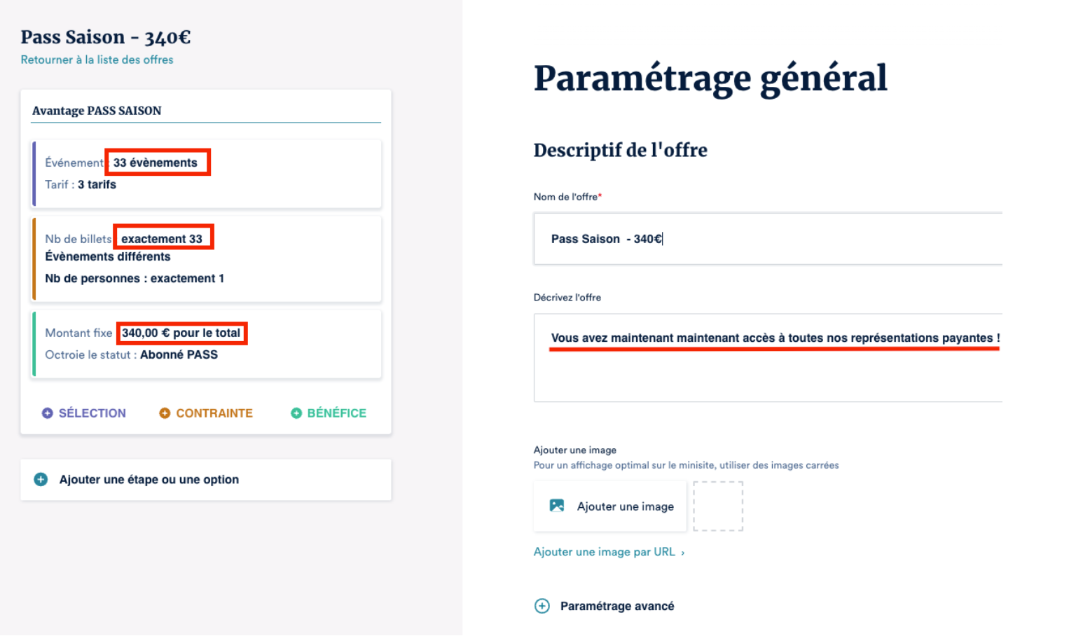La procédure expliquée ici est basée sur un exemple et est donc fortement susceptible d'être modifiée en fonction de votre besoin. Les noms de tarifs, les noms d'événements, les descriptions et titres de l'offre seront alors à adapter à votre offre/abonnement. Découvrir l'interface des offres