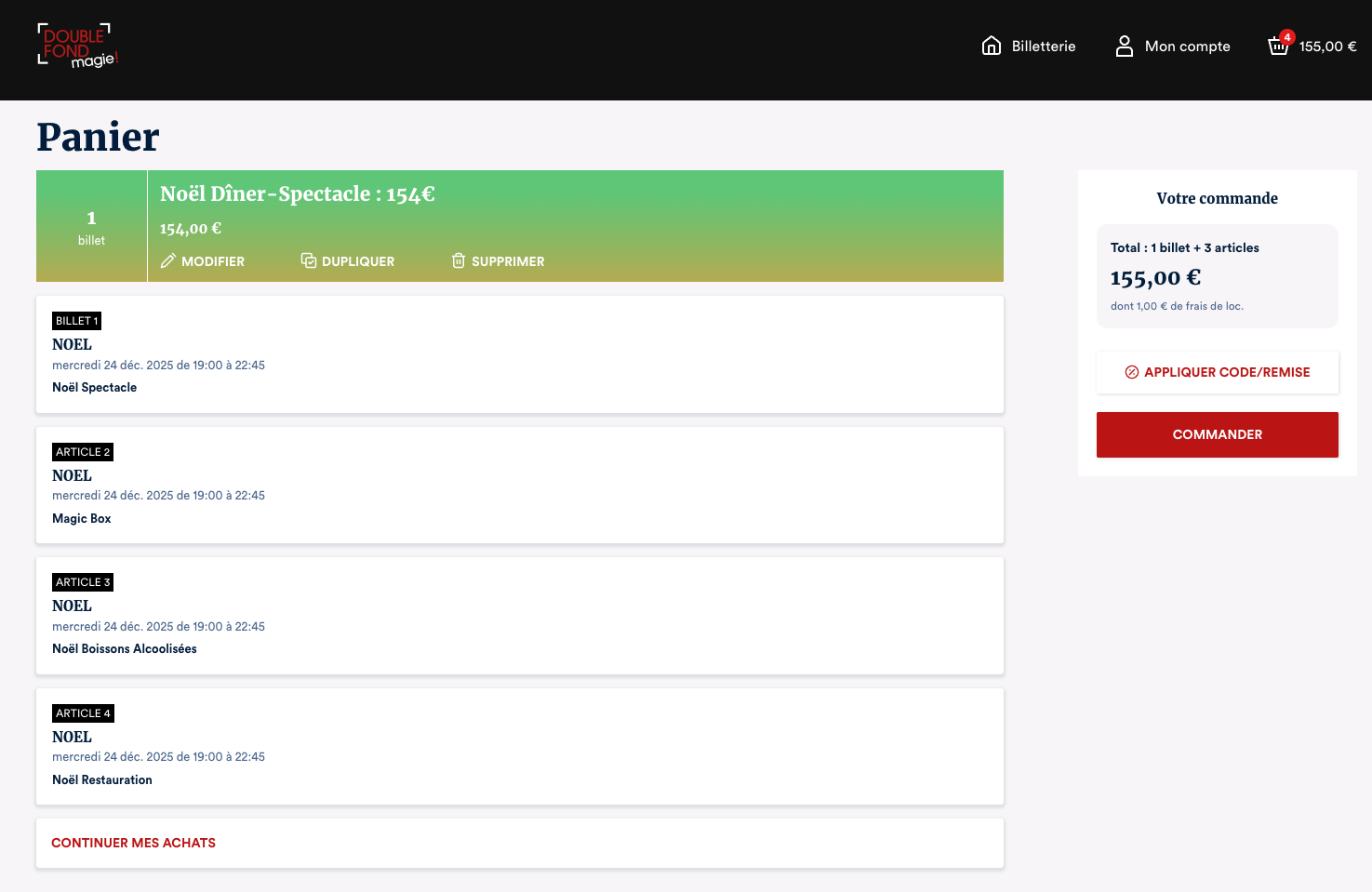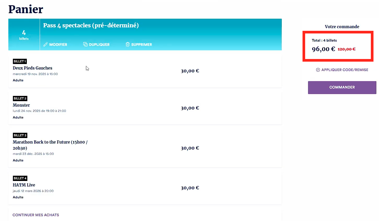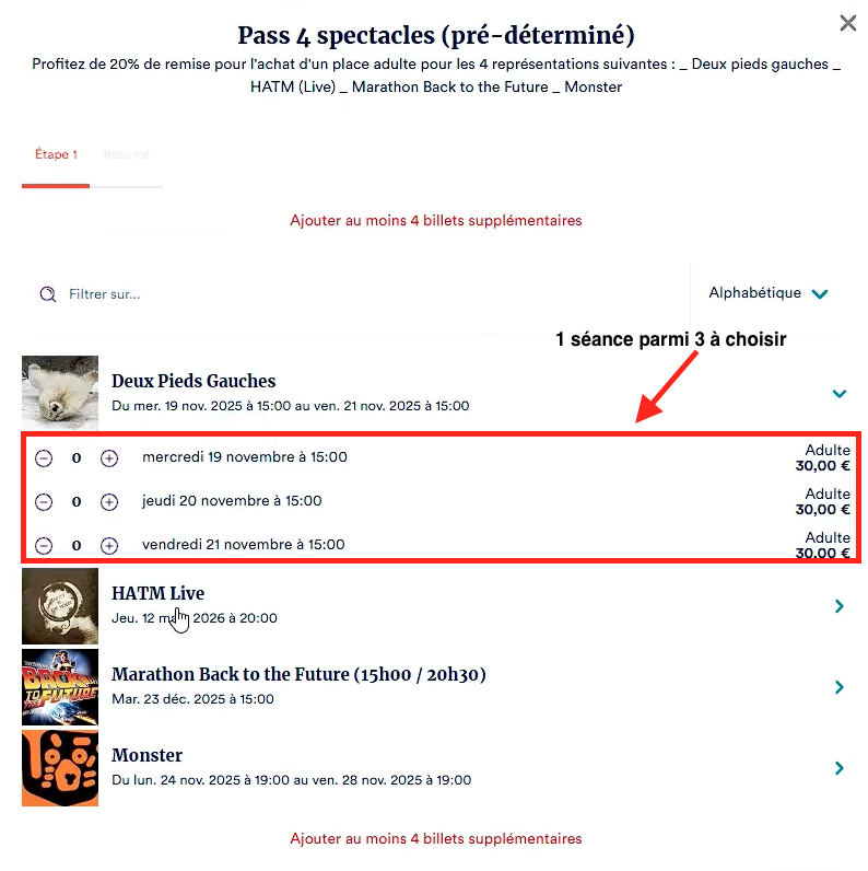 Aucune modale de sélection des spectacles ne s'affiche : la mise au panier des 4 places est automatique : elle se fait en un clic si tant est qu'une seule séance soit disponible pour chaque événement.