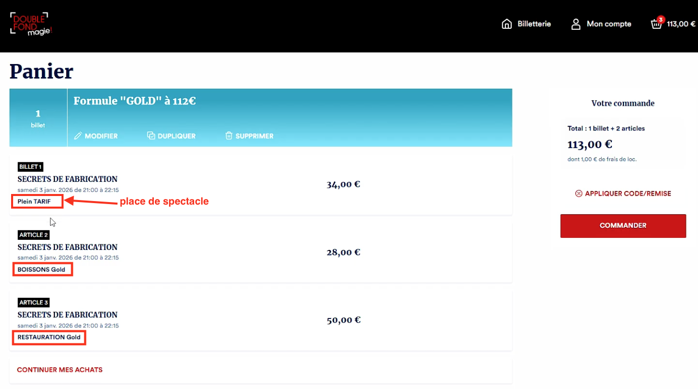 - Exemple 2 : Je crée une formule "Dîner + spectacle"
