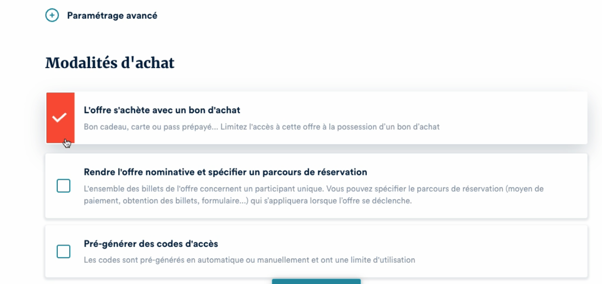 Dans ce cas, au niveau du paramétrage général de l'offre, il s'agit de renseigner le fait que l'offre s'achète avec un bon d'achat : case à cocher