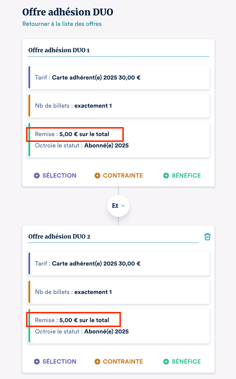 - Exemple n°2 : Je propose l'achat de deux cartes d’adhésion avec 1 remise de X € accordée