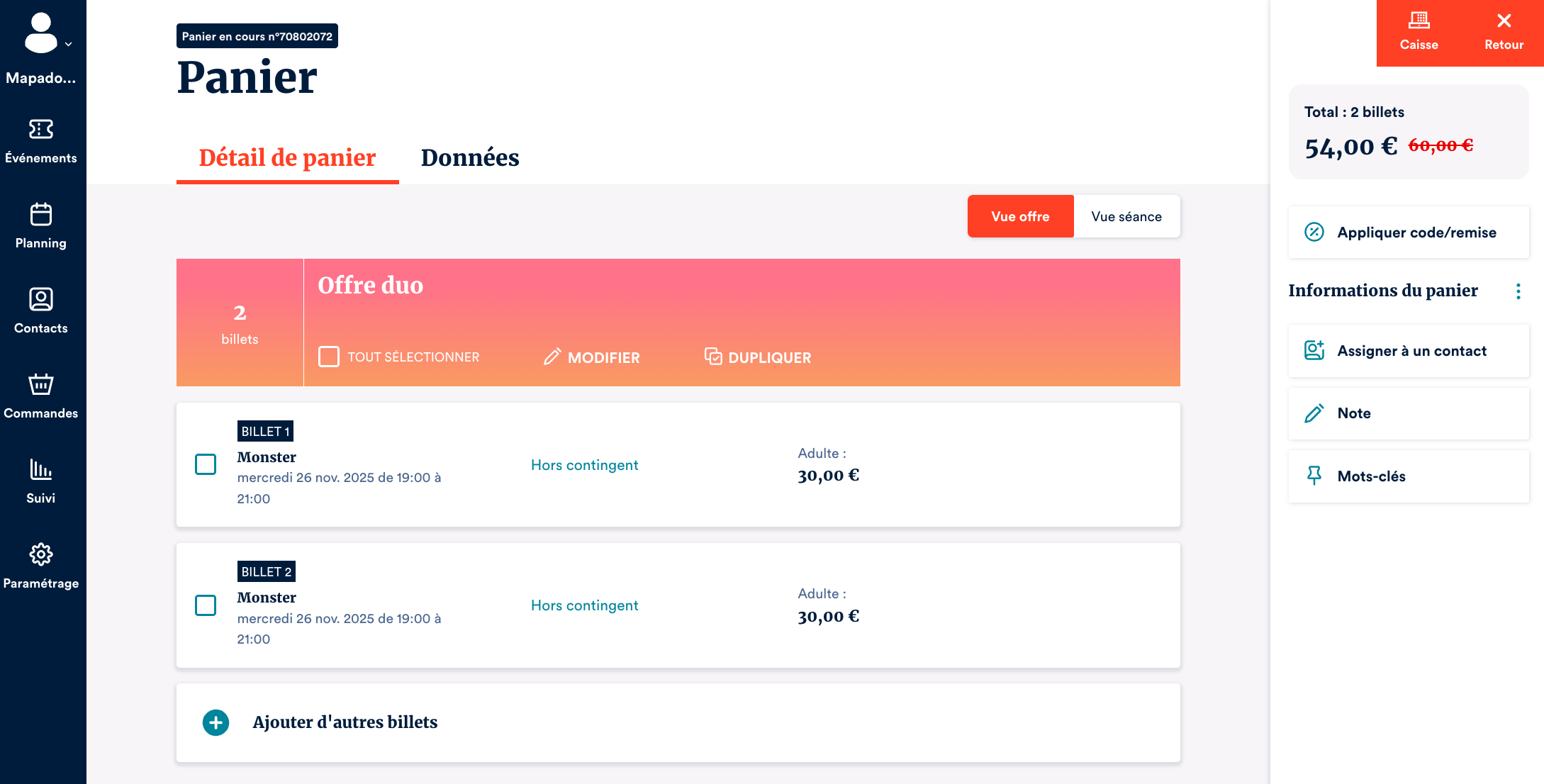 Une fois la séance renseignée, l'offre se déclenche : la remise est bien appliquée :