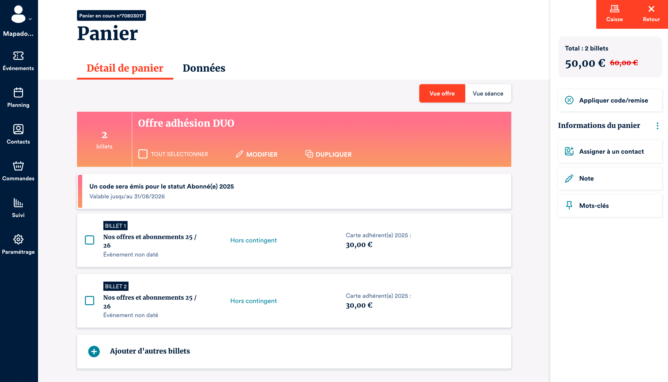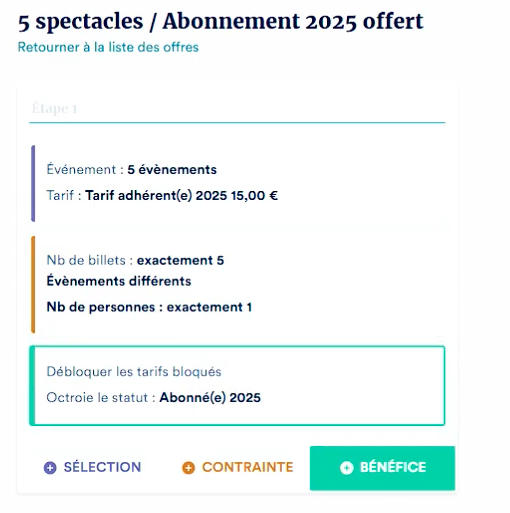 mais également d'accorder à l'acheteur le statut d'adhérent sur la saison afin qu'il puisse profiter du tarif adhérent sur des événements supplémentaires (qu'il souhaiterait acheter par la suite en effectuant de nouvelles commandes).