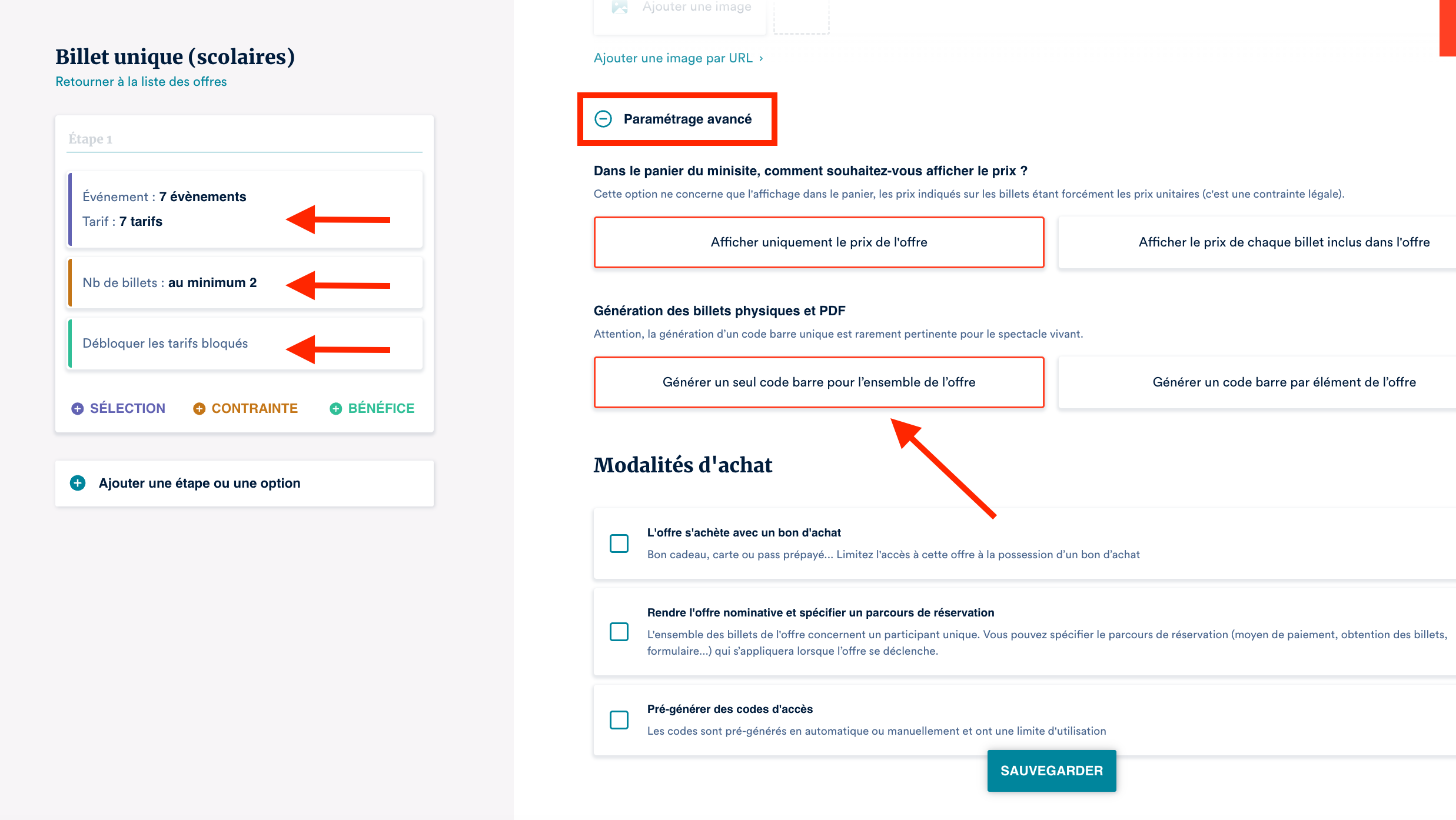 Au niveau du paramétrage général de l'offre, dans "Paramétrage avancé", il s'agit de bien cocher "Générer un seul code barre pour l'ensemble de l'offre"