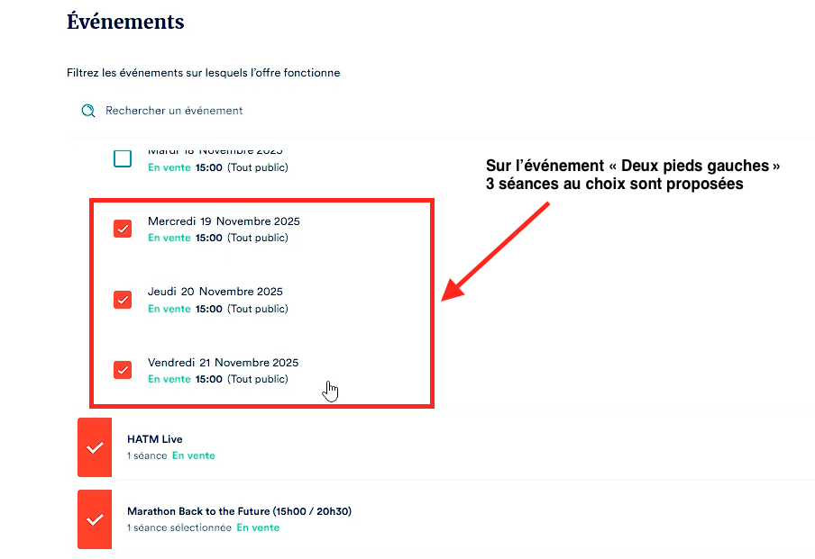 - Exemple 2 : Je crée un Pass adulte X spectacles : avec une sélection d'événements qui est "imposée"