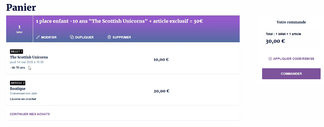 Il s'agit en l'occurrence d'une offre exceptionnelle qui vient ajouter un article donné (ici une licorne en crochet !) à une place de spectacle (ici "The Scottish Unicorns).