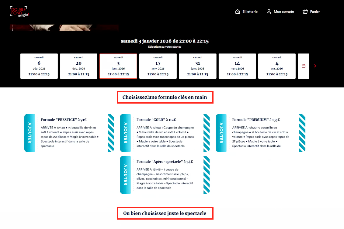 Les différentes offres de restauration peuvent alors être mises en avant au sein de la page de l'événement concerné ce qui permet de rappeler que le choix est possible entre le spectacle "seul" ou la formule "spectacle + restauration".