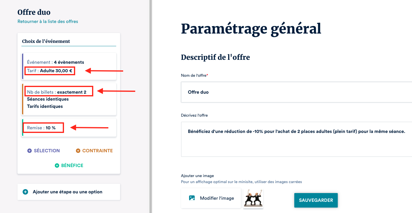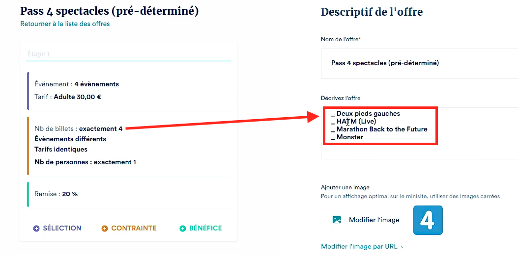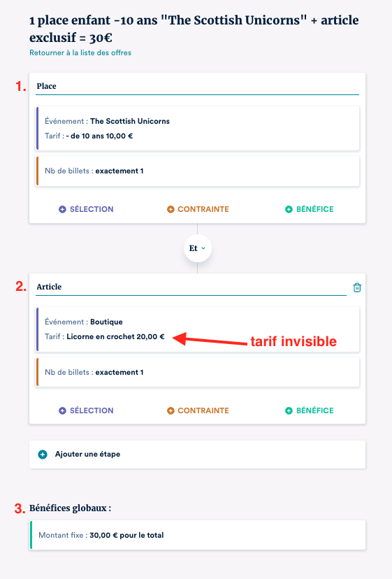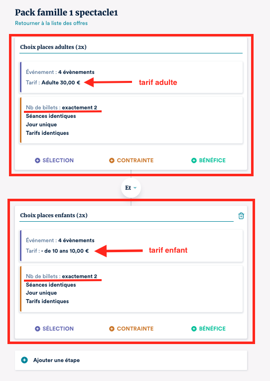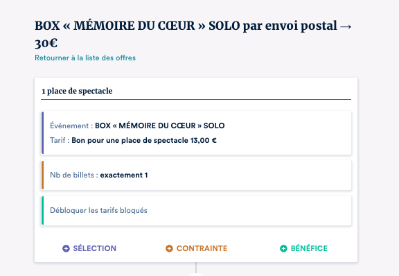 - Exemple 1 : Je crée un pack qui contient des places de spectacles et un article