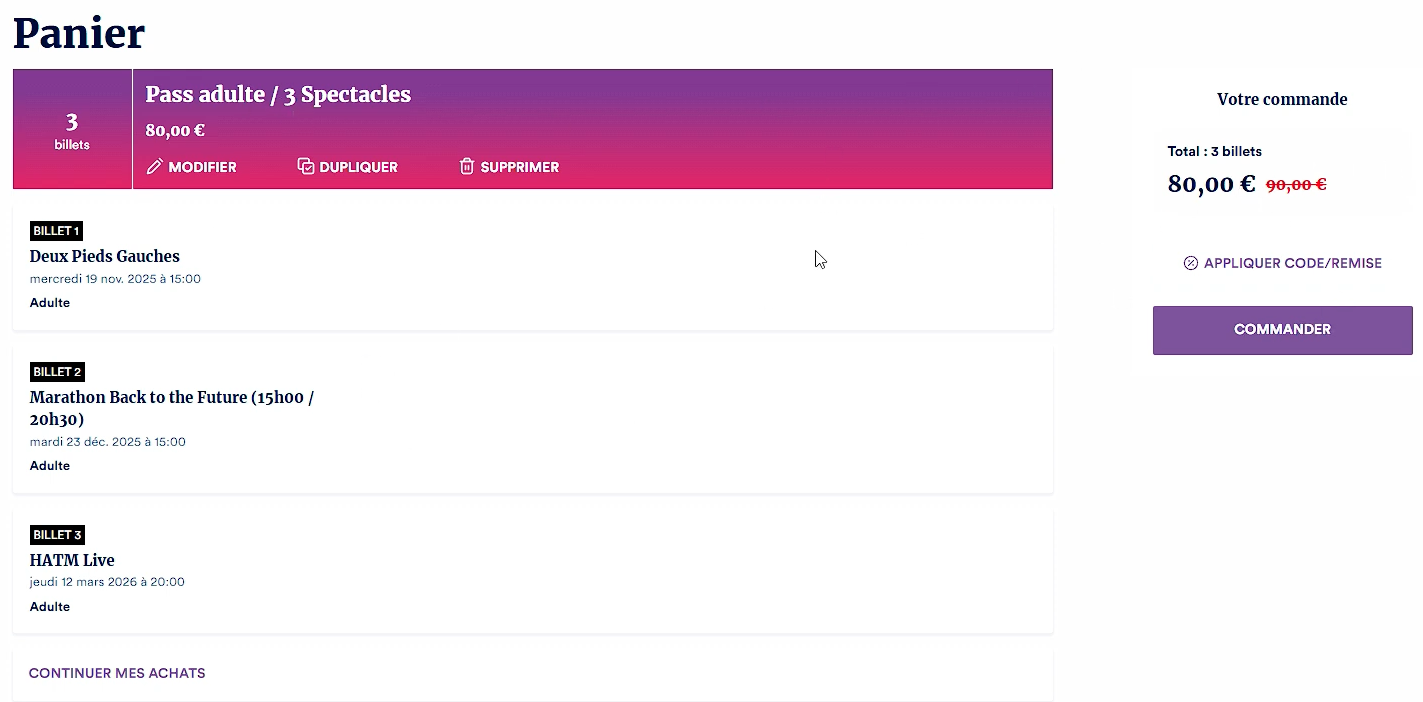 A noter qu'il est aussi possible de réunir sous un seul billet l'ensemble de la commande : cela dans un but de scan unique pour gagner du temps au moment de l'entrée en salle.