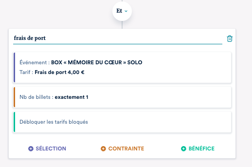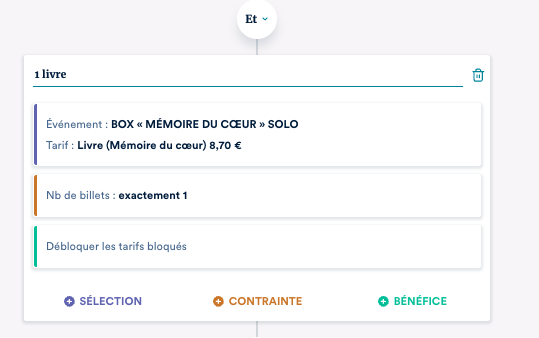 A noter qu'il est également possible de paramétrer un tarif "groupe" remisé (plus intéressant que le tarif plein) et bloqué qui ne s'appliquera qu'une fois que le nombre minimum de billets requis sera respecté. A partir de 10 billets, la place passe à 18€ au lieu de 20€ par exemple.