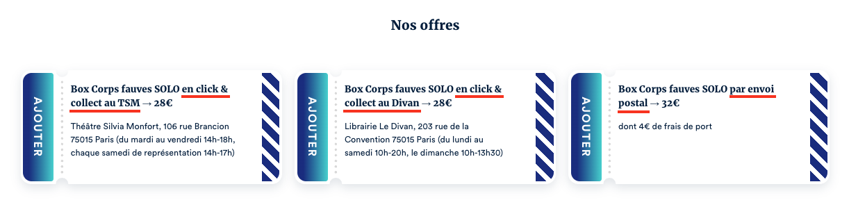 Si mode de retrait est sur place (en click & collect au théâtre ou bien à la librairie partenaire le Divan) ou bien par envoi postal