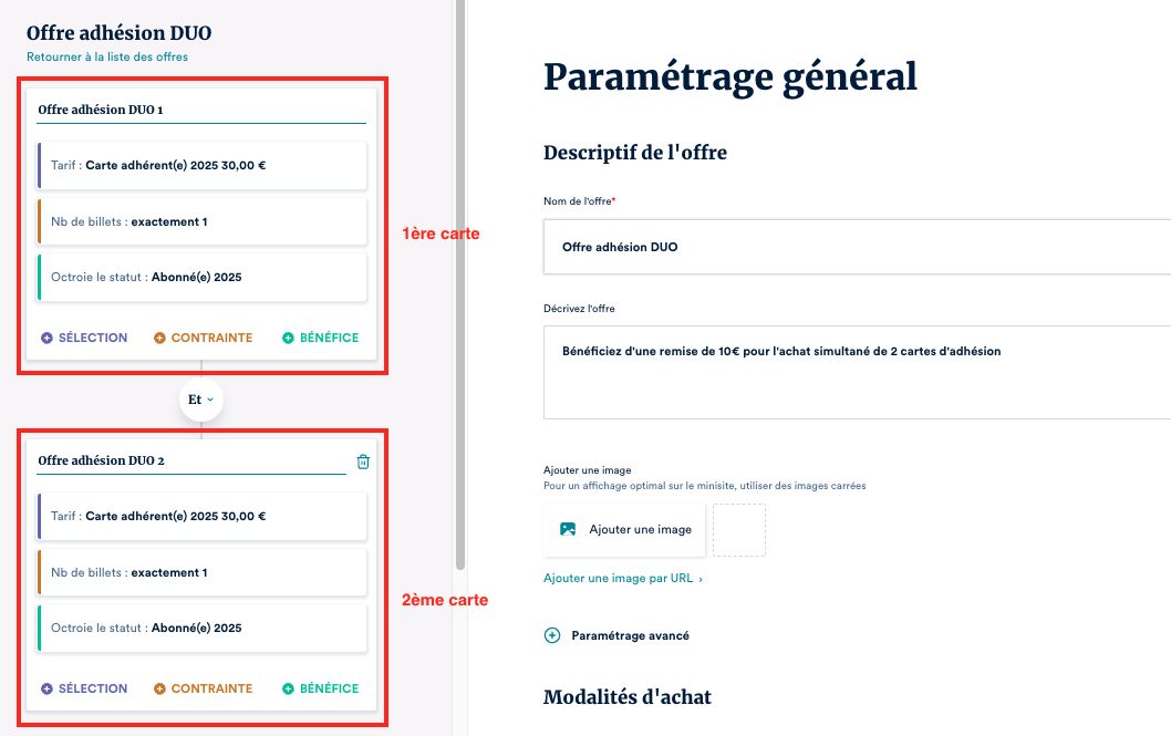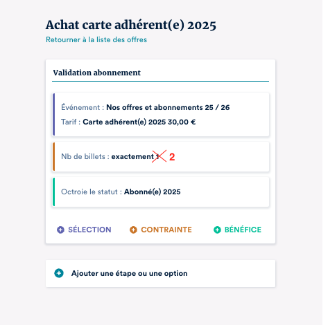 S'il peut être tentant de permettre l'achat de 2 cartes d'adhésion en une seule fois en renseignant le chiffre "2" au niveau de la partie "Contrainte" (au lieu de créer 2 blocs), il y a cependant un risque que seul 1 seul code adhérent soit émis pour les 2 cartes.