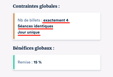 Il s'agit d'une offre qui accorde une réduction de X % dès lors que 2 billets sont pris au même tarif et pour la même séance.