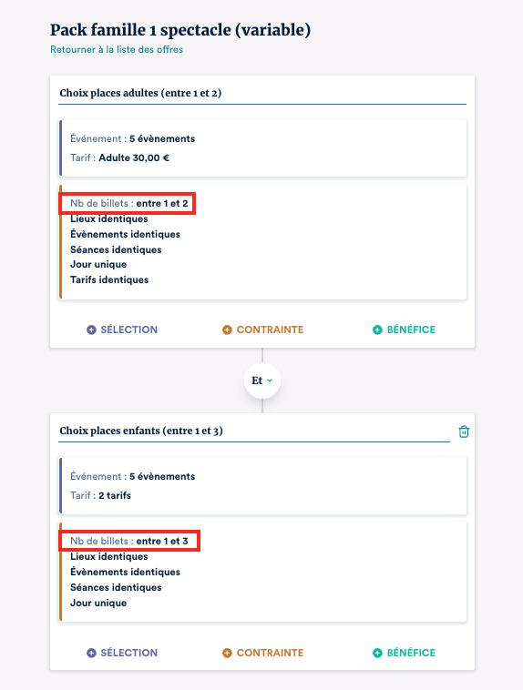 Le nombre de billets est alors fixe dans chacun des 2 blocs : l'un pour les adultes, l'autre pour les enfants : la contrainte est en effet de 2 billets exactement