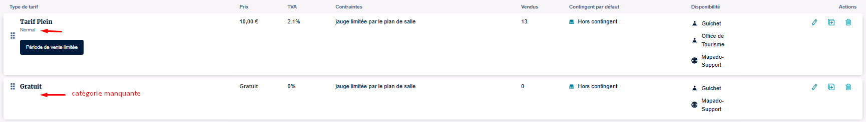 Dans ce cas par exemple, le tarif gratuit ne peut pas être vendu car lié à aucune catégorie, contrairement au Tarif Plein qui est lié à la catégorie Normal.