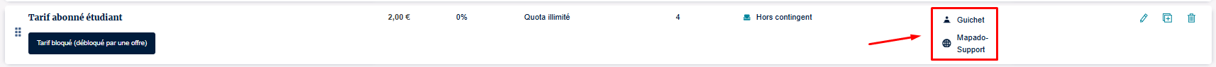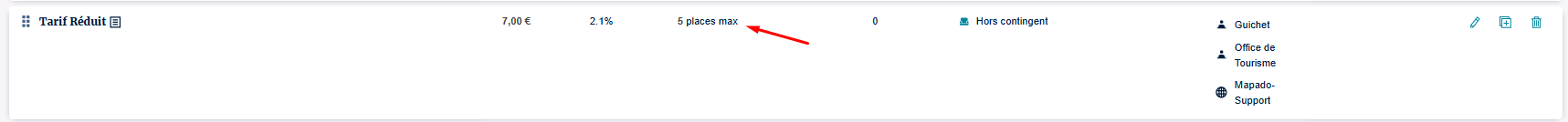 Ici, le "Tarif Réduit" est limité à 5 places. Si la colonne "vendus" est égale au quota paramétré sur le tarif, il n'est alors plus disponible.