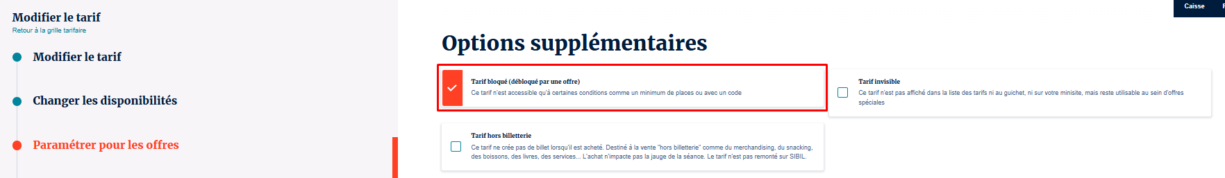 Depuis la grille tarifaire, lorsque vous créez un tarif, vous pouvez définir que celui-ci soit bloqué. Ainsi, lors de l'ajout de vos tarifs dans vos séances, celui-ci sera automatiquement bloqué à l'achat sous conditions.