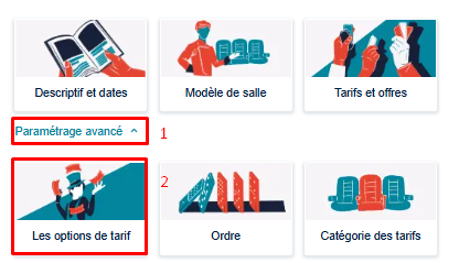 Depuis l'interface qui s'affiche, vous devez donc sélectionner l'/les événement/s sur le/squel/s le ou les tarifs est/sont paramétré/s puis cliquer sur "Paramétrage avancé" (1) -> Les options de tarif (2) :