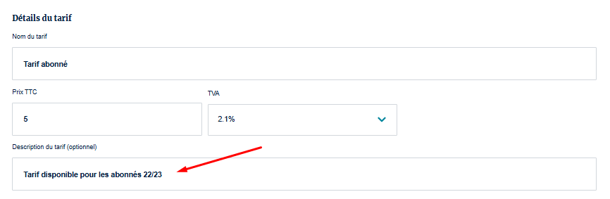 Pour que le participant puisse avoir connaissance de ces conditions, il est préconisé de les expliquer depuis la description du tarif en question (comme ci dessous). Il est alors affiché dans le détail du panier (comme ci dessus)